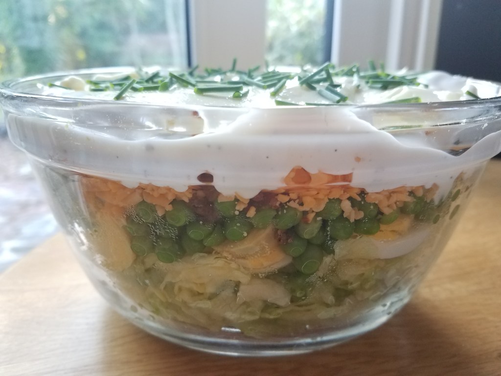 The basic concept of creating this salad is to gently stack each ingredient one a time in a serving dish. Fill a large bowl with chopped iceburg lettuce. (I prefer to use a clear glass bowl so each layer is visible.) Slice the hard boiled eggs and layer on top of the lettuce. Then layer each of the next ingredients: thawed frozen peas, crumbled bacon, and shredded cheddar. Use enough mayonnaise to cover the salad and sprinkle with scallions. Chill in the refrigerator for a few hours. Before serving, gently mix the salad.