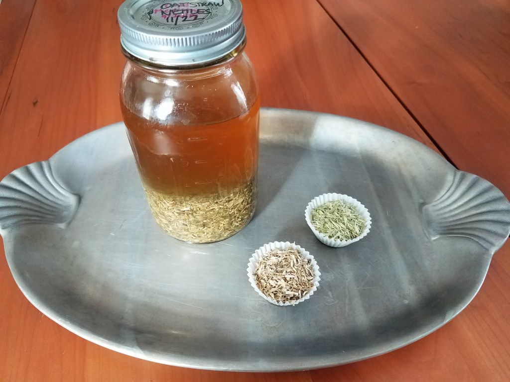 A tincture is a extract involving herbs that soak in a menstruum, or base liquid of alcohol or vinegar. I regularly use vodka as my menstruum. I place the herbs in a glass jar, cover them with the menstruum, and let it sit in a sunny place for four weeks. The liquid is strained of the herbs and then rebottled. Mountain Rose Herbs has an excellent tutorial on how to make a tincture.