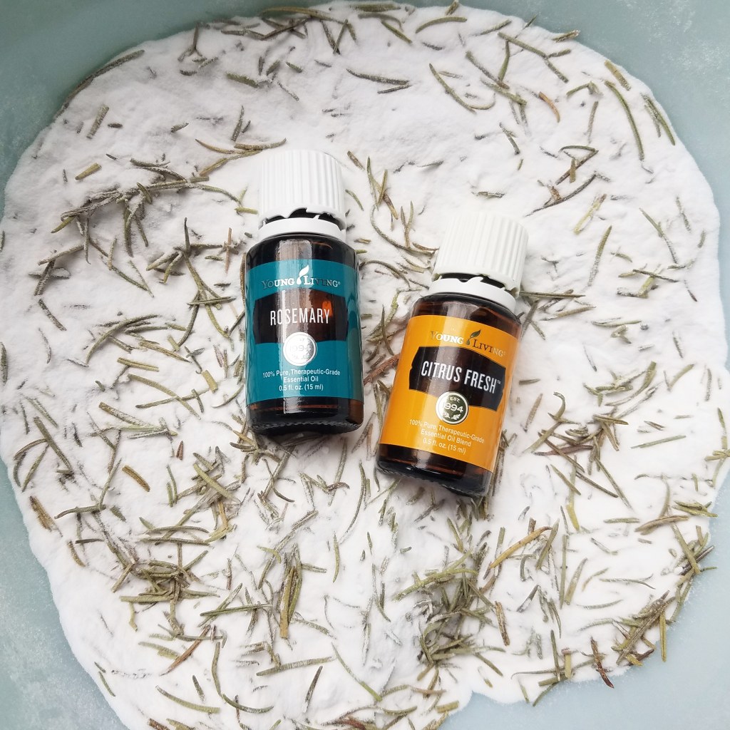 Measure the baking soda in a large bowl and combine with the dried rosemary if using. Add the drops of essential oils while whisking the baking soda to keep it from clumping.