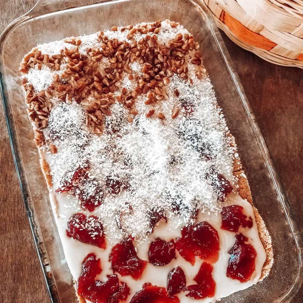 Combine crumbs, sugar, and melted butter. Press into the bottom of a 13 x 9 inch baking pan. Open the can of sweetened condensed milk. Add the drops of lemon vitality oil into the milk and stir until combined. Drizzle onto of the graham cracker crumb layer. Carefully spoon the preserves on top. Sprinkle with the coconut and then the nuts.