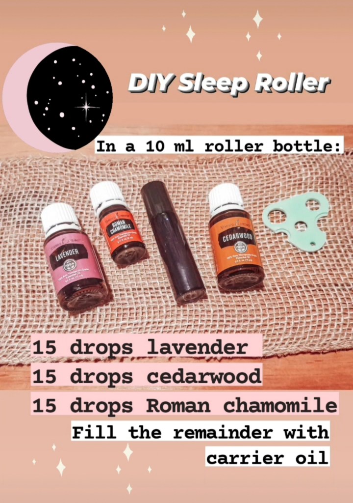 I love making essential oil rollers. Take a 10 ml glass bottle with a roller top, fill it with 30 to 40 drops of essential oils to address your concern, and top it off with carrier oil. Roll onto wrists, neck, and chest. They are so simple to make and yet so helpful! Here is one I make to assist my journey into dreamland. Put this one on your right big toe before bed–reflexology will tell your brain to fall asleep.