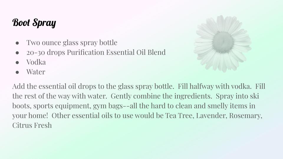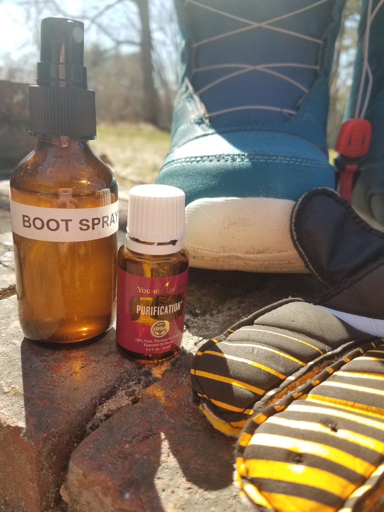 However, some pieces are hard to clean and definitely not able to fit in the washing machine. Snow/ski/snowboarding boots are the largest group. Gloves and ski bags always need to be wiped down. I have found that spring air and sunshine make excellent “cleansers” for sweaty and smelly equipment. I sit everything outside, and then spritz them with a homemade “Boot Spray.” This process freshens everything up before packing it away for 6 months. I have also used this spray for other hard to clean sports gear like goalie gloves, softball gloves, roller derby pads, and equipment bags.