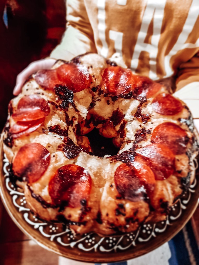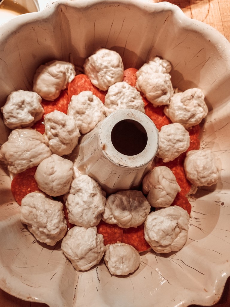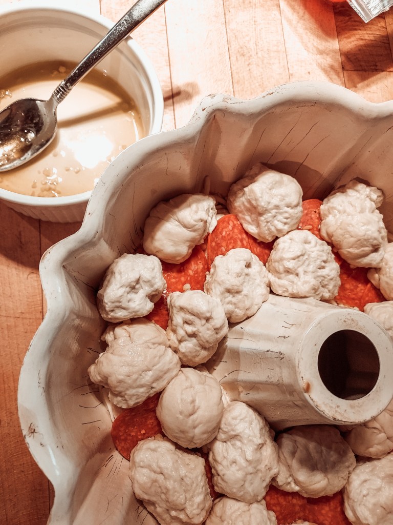 - Continue making layers of dough balls dipped in olive oil, cheese, and pepperoni until dough is gone