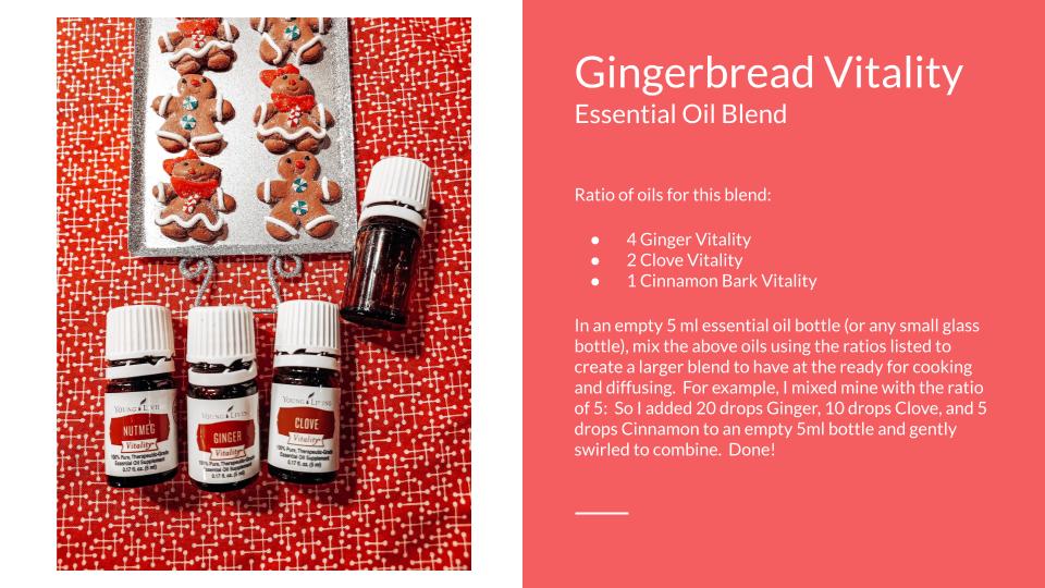 I created a gingerbread blend with my Young Living Vitality essential oils. With the Vitality line, they are labeled for ingestion and diffusing so I like adding a drop or so to my recipes. Because of the Seed to Seal Commitment and the quality of Young Living’s essential oils, I feel comfortable using my oils in this way. (Before ingesting any essential oils, do your research! Find out if the brand is safe and of high quality and if the oil itself is one that can be taken internally.)