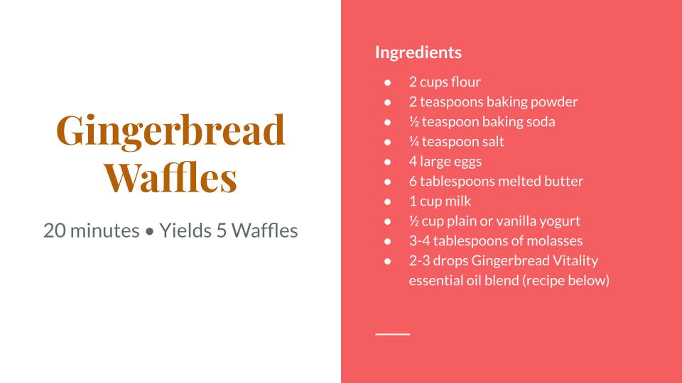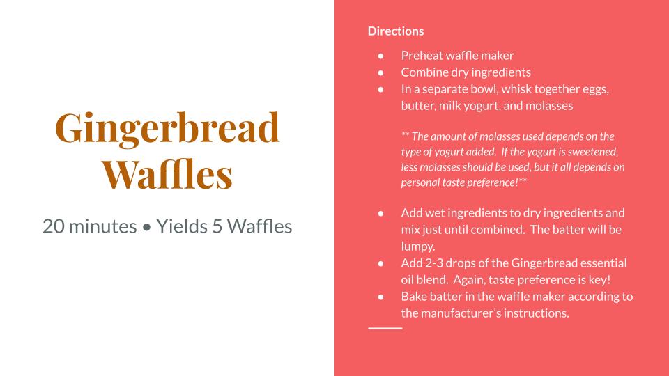 Now that I created my “spice blend,” it was time to bake! I hope you enjoy my recipe for Gingerbread Waffles. Try the Gingerbread Blend in your diffuser too! Add 3 or 4 drops to the diffuser to create a warm and inviting aroma to your living space.