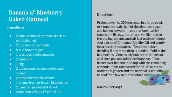 I love the combination of blueberries and bananas. If only I had bananas growing in my backyard, but definitely the wrong growing zone for that in Northern New England! The dish is flavored with Cinnamon Vitality Oil. I absolutely love baking with Young Living’s Vitality Essential Oil line. These oils have been tested and are safe for internal use. The Vitality Oils pack a huge punch of flavor–a drop or two is all you need, sometimes even just a “toothpick swirl” will do it. Enjoy!