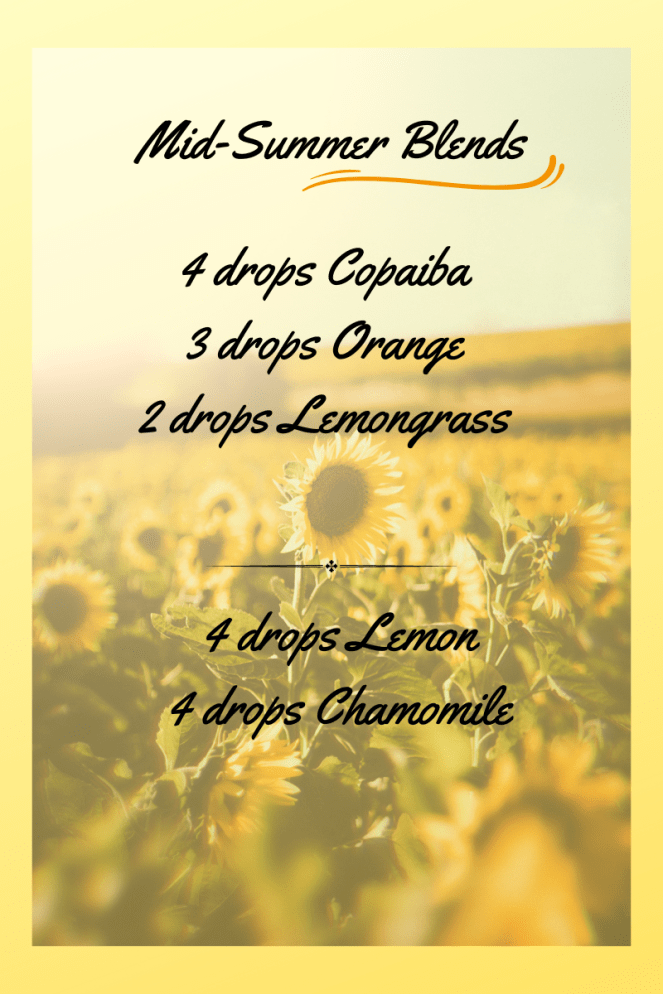 The images used in this post are ones that I took at a recent sunflower festival in Southern New Hampshire. Coppal House Farm hosts this annual event that is just delightful! Casually wander through fields of sunflowers, and enjoy music and food, too. I created these sunny blends with the sunflowers on my mind. Diffuse these blends as you enjoy the last warm weeks of August. They each still have a bright element of the season, but also a warm, earthy undertone as well.