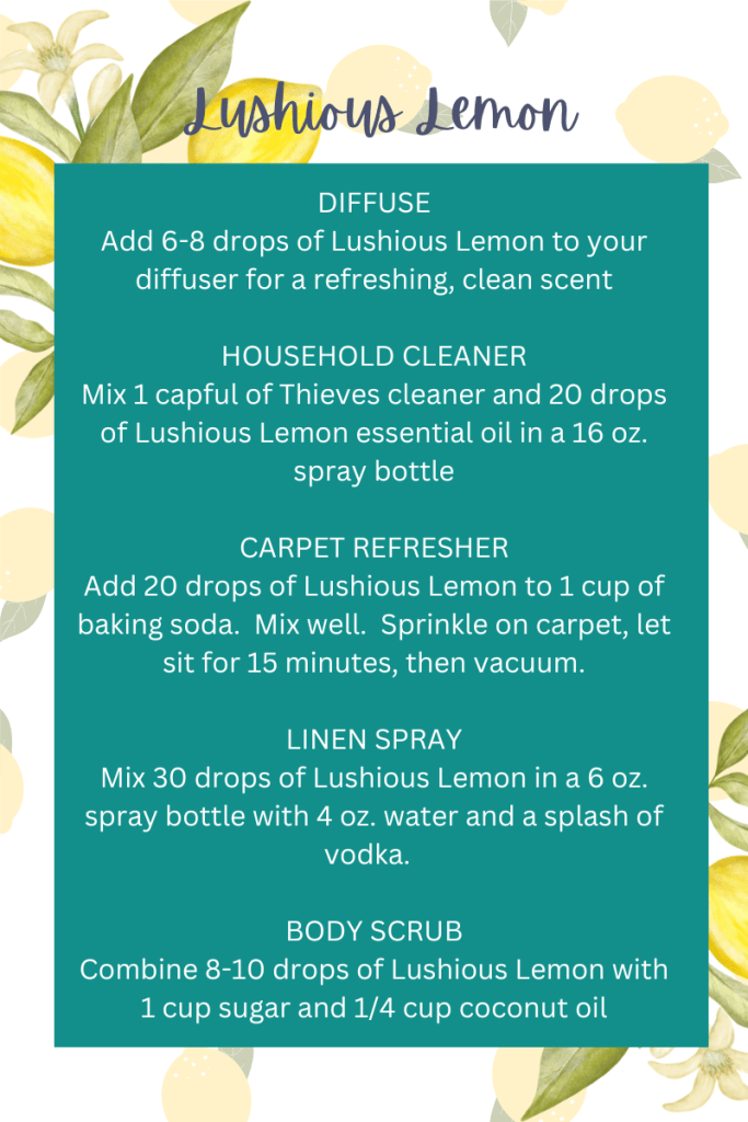 My favorite way to use this essential oil blend is to diffuse it or to add it to my Thieves Household Cleaner in a spray bottle. I clean because I know that I should, not because I am one of those people who enjoys tidying up the home. Using the Lushious Lemon really helps brighten my emotions as I move through my chores.