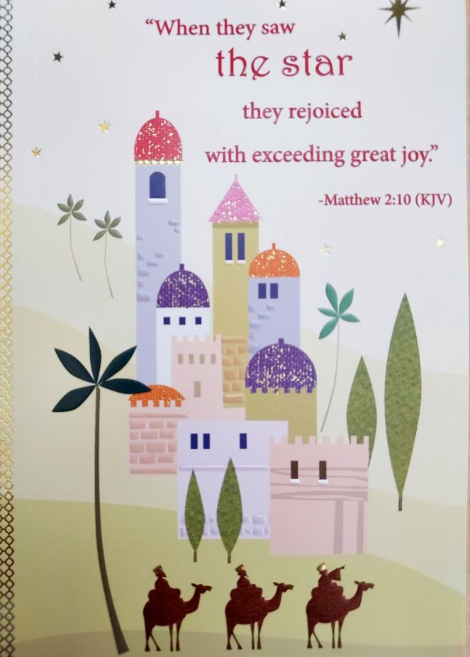 “And behold, the star that they had seen at its rising preceded them, until it came and stopped over the place where the child was. They were overjoyed at seeing the star, and on entering the house they saw the child with Mary his mother. They prostrated themselves and did him homage. Then they opened their treasures and offered him gifts of gold, frankincense, and myrrh.” ~Matthew Chapter 2